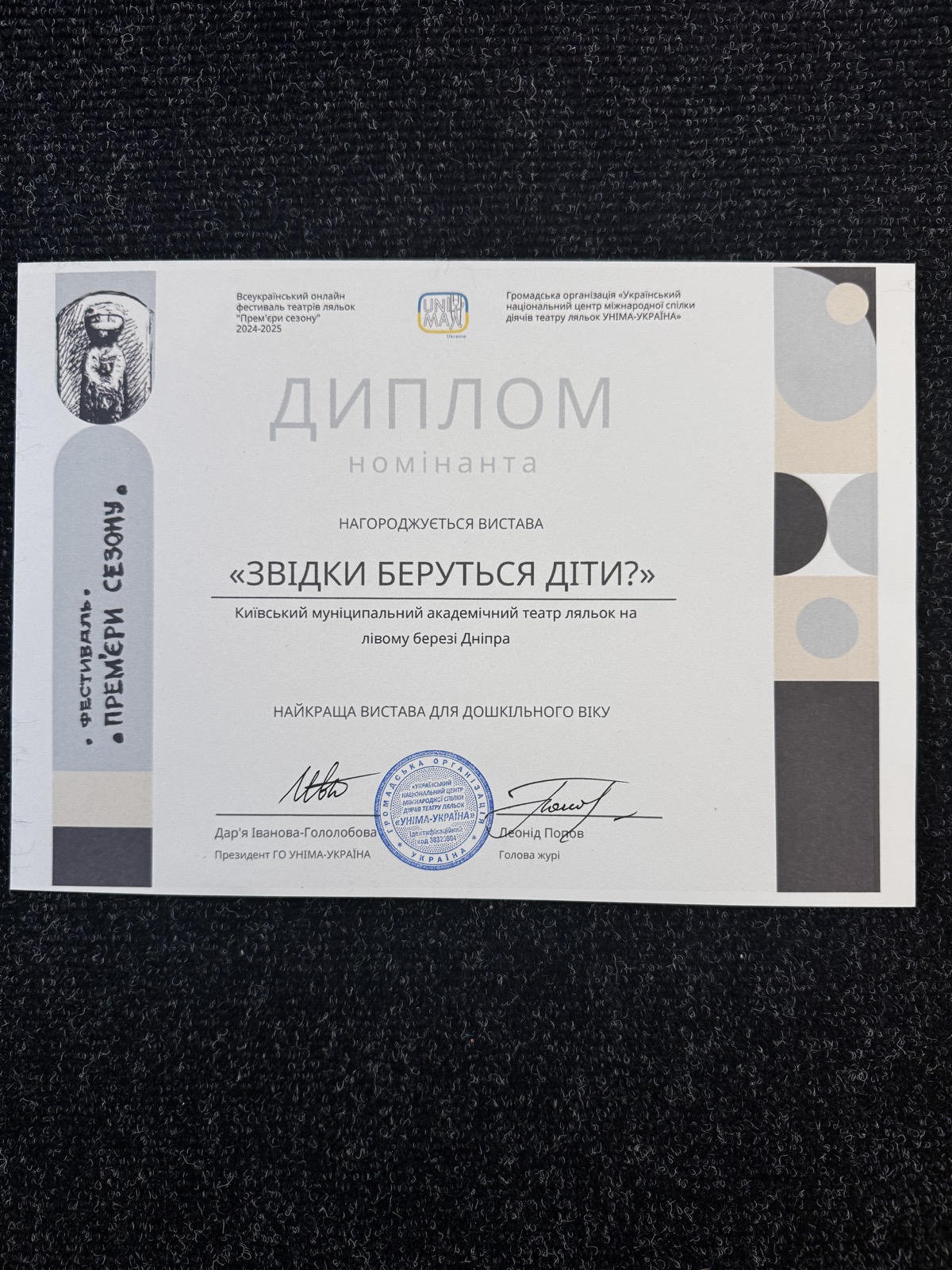 Наша вистава «ЗВІДКИ БЕРУТЬСЯ ДІТИ?» отримала диплом номінанта в номінації «Найкраща вистава для дошкільного віку».